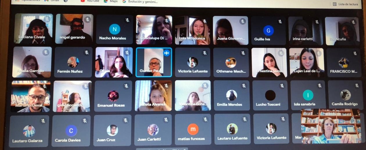 Ciudadano del mundo, ameno, formado académicamente, comprometido con las jóvenes generaciones que buscan mejorar el destino de nuestro planeta, accedió a una video llamada desde Alemania través de la iniciativa de las estudiantes de 6to año Irina Carletti, Giovanna Licciardi, Sol Acuña y Luján Leal de Ibarra quienes, en el contexto del espacio curricular Economía, a cargo de la docente Celeste Crespo, elaboraron una infografía de las bases en las que se sustenta la Economía Azul, a partir de la observación de videos y de la visita a las páginas oficiales del economista. La curiosidad por profundizar más en el tema las impulsó a ponerse en contacto directo con él, logrando concretar este valioso encuentro virtual.
