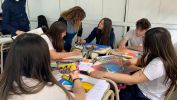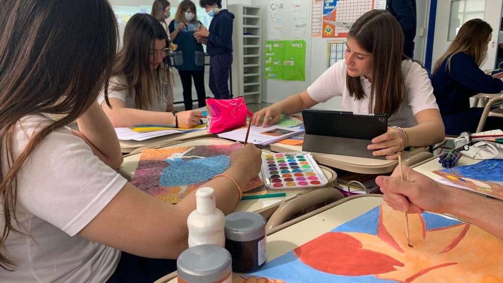 En la foto vemos a los alumnos de 4 to año recreando obras artísticas del movimiento futurista/ fauvista. Toman como fuente de inspiración una obra característica del movimiento y recrean y agregan su impronta. Recrear una obra es una forma de homenajear al artista que la ejecutó e internalizar el aprendizaje.